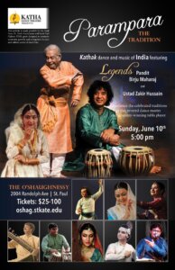 On behalf of Katha Dance Theatre, I am pleased to welcome you to Parampara-THE TRADITION for the presentation of Concert of the Legends. I am deeply grateful to the maestros Pandit Birju Maharaj, my Guru in Kathak dance, and Ustad Zakir Hussain in tabla, the matchless combination and the lovable pairing by Indian dance and music connoisseurs, for sharing their arts today! You may have noticed that this program has delightful elements of “The Family. This was a conscious decision on my part. I wanted to present the distinct identity: the tradition of ‘Guru – Shishya Parampara’ (The Discipleship thus creating an extended family) with an emphasis on this great art-form Kathak dance. I also wanted to celebrate the achievements of our Guru Pandit Birju Maharaj along with his family, including Minnesota’s Katha Dance Theatre with its contemporary aesthetics and emerging trends in storytelling and dance.